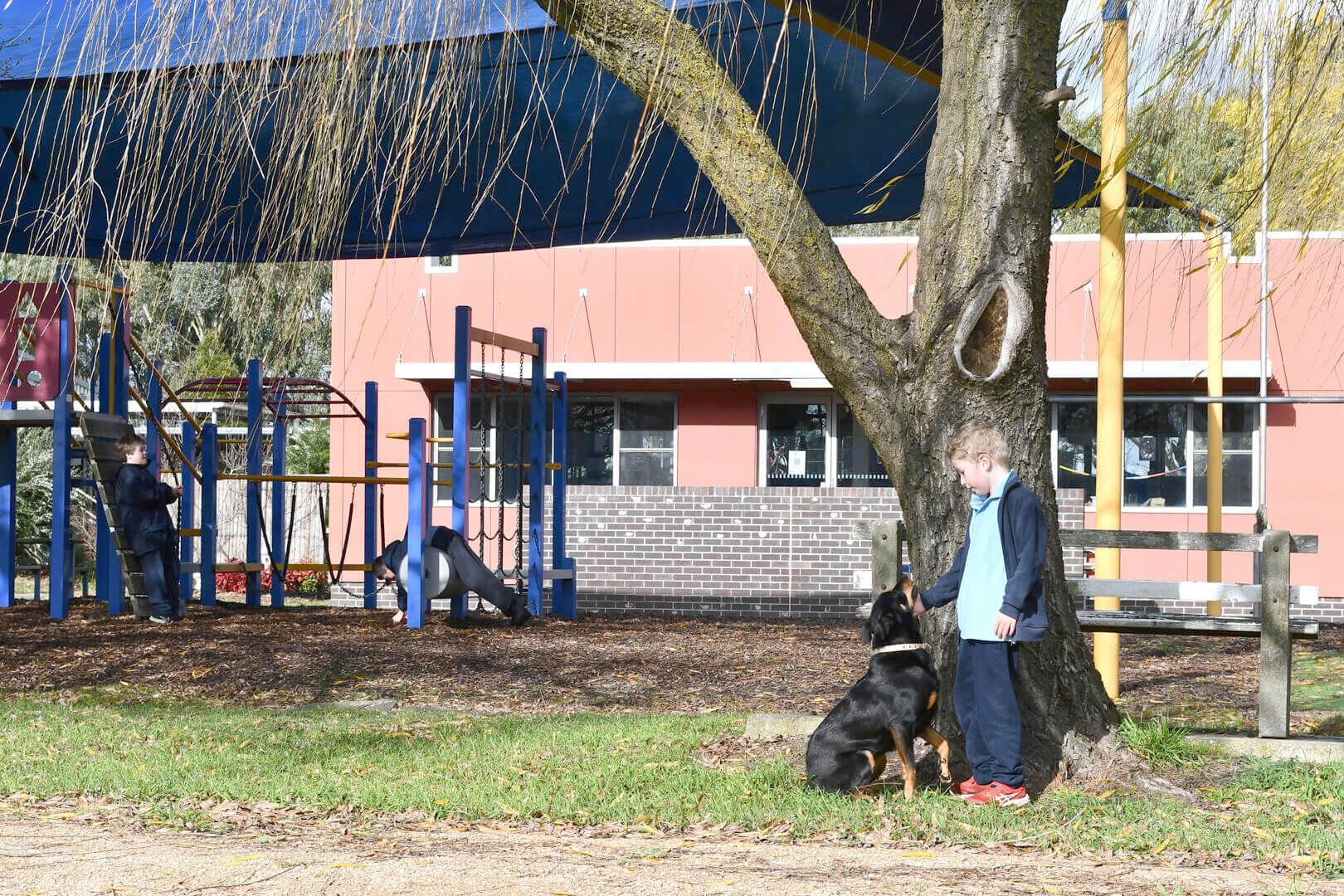 Our spacious school grounds consist of a playground, oval, basketball court, large concreted undercover area, sensory play space and cubby, vegetable gardens and running track, all of which are linked to the classroom learning.