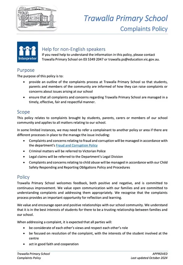 • provide an outline of the complaints process at Trawalla Primary School so that students, parents and members of the community are informed of how they can raise complaints or concerns about issues arising at our school