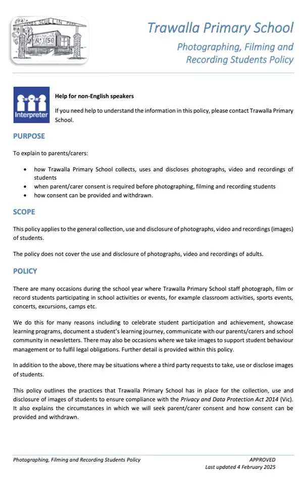 • how Trawalla Primary School collects, uses and discloses photographs, video and recordings of