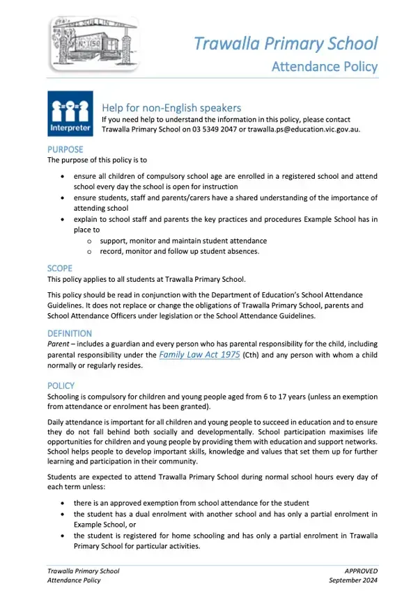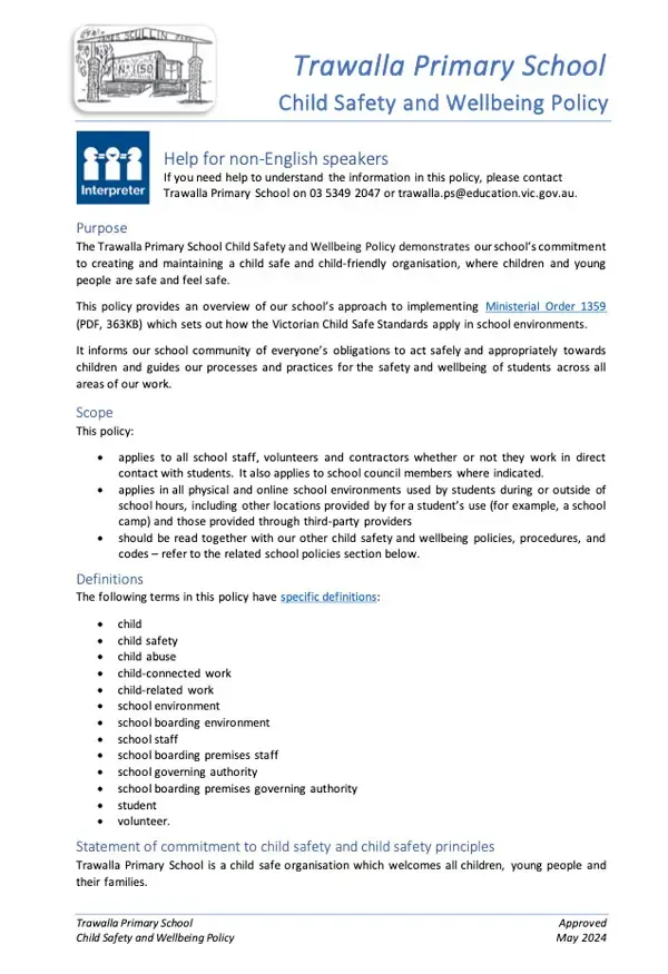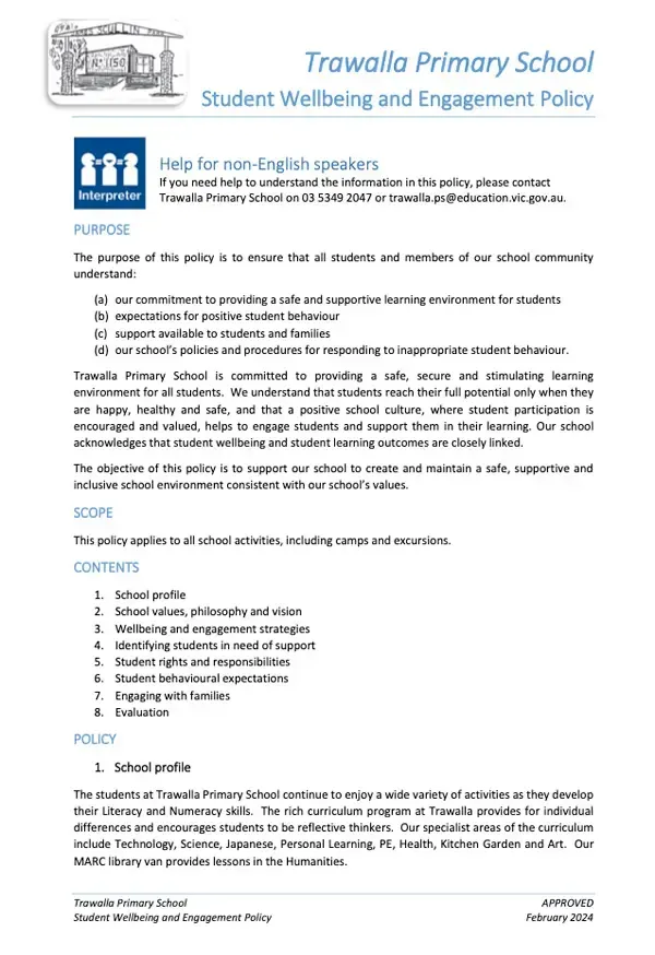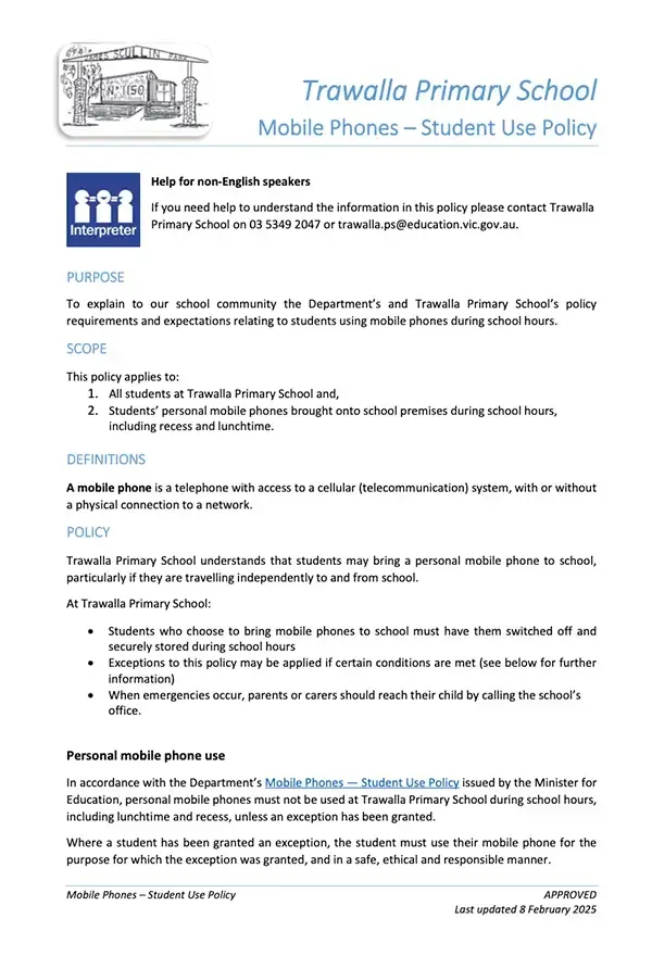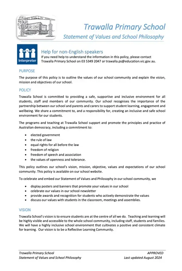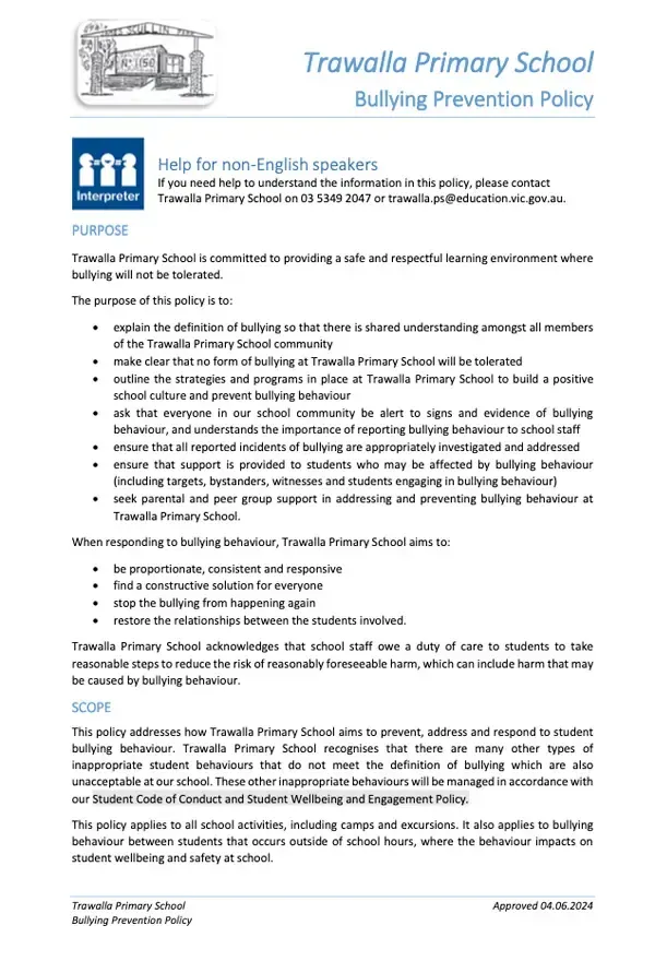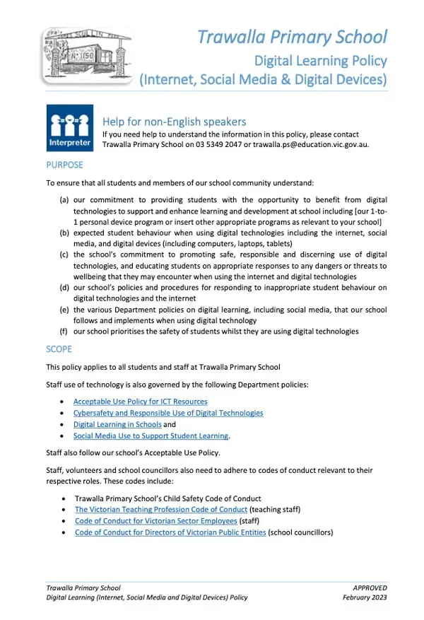 This policy is to explain to our school community the Department’s and Trawalla Primary School’s policy
