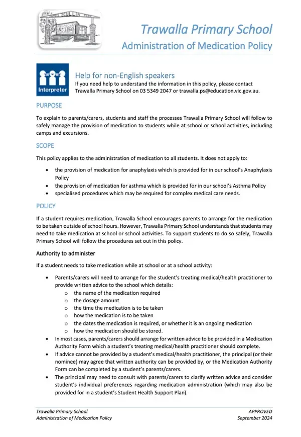 This policy is to explain to parents/carers, students and staff the processes Trawalla Primary School will follow to safely manage the provision of medication to students while at school or school activities, including camps and excursions.