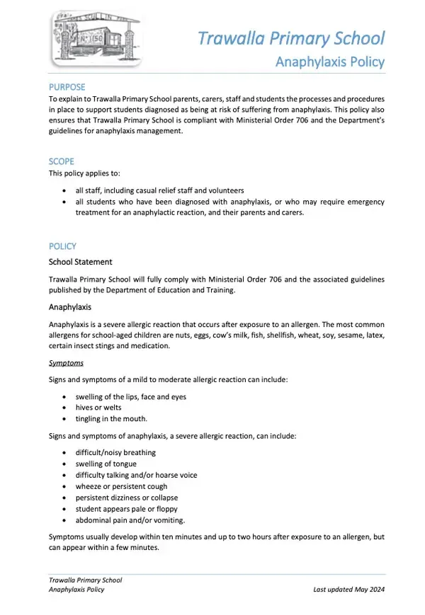 This policy is to explain to Trawalla Primary School parents, carers, staff and students the processes and procedures in place to support students diagnosed as being at risk of suffering from anaphylaxis. This policy also ensures that Trawalla Primary School is compliant with Ministerial Order 706 and the Department’s guidelines for anaphylaxis management.