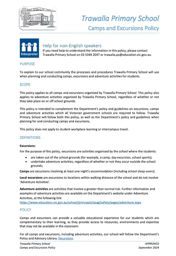 This policy is to explain to our school community the processes and procedures Trawalla Primary School will use when planning and conducting camps, excursions and adventure activities for students.