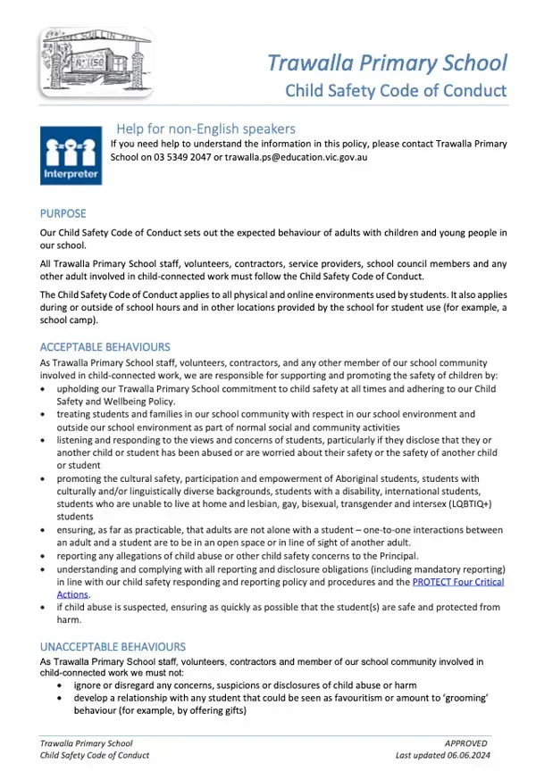 All Trawalla Primary School staff, volunteers, contractors, service providers, school council members and any other adult involved in child-connected work must follow the Child Safety Code of Conduct.