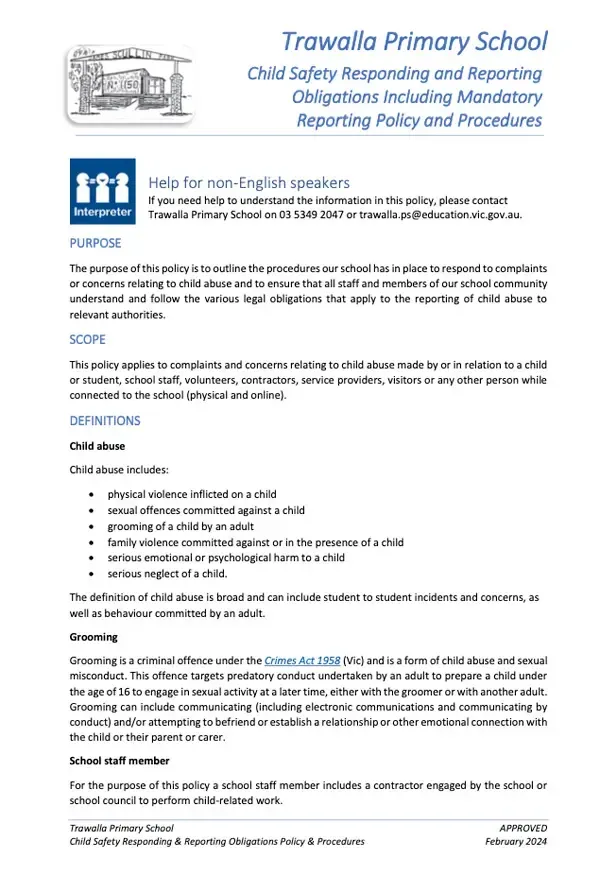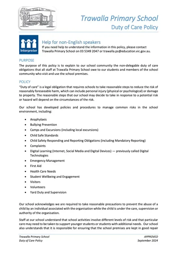 The purpose of this policy is to explain to our school community the non-delegable duty of care obligations that all staff at Trawalla Primary School owe to our students and members of the school community who visit and use the school premises.
