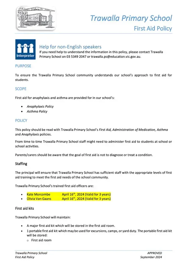 This policy is to ensure the Trawalla Primary School community understands our school’s approach to first aid for students.