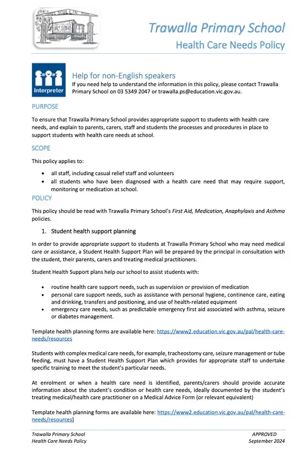 This policy is to ensure that Trawalla Primary School provides appropriate support to students with health care needs, and explain to parents, carers, staff and students the processes and procedures in place to support students with health care needs at school.