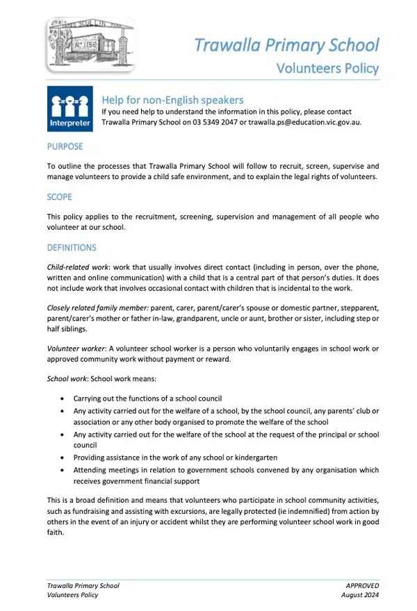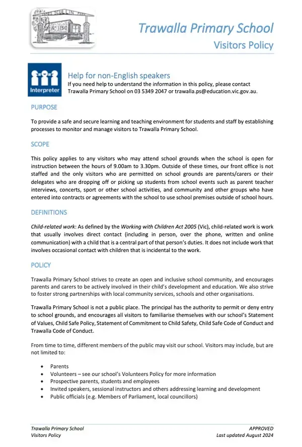 This policy aims to provide a safe and secure learning and teaching environment for students and staff by establishing processes to monitor and manage visitors to Trawalla Primary School.